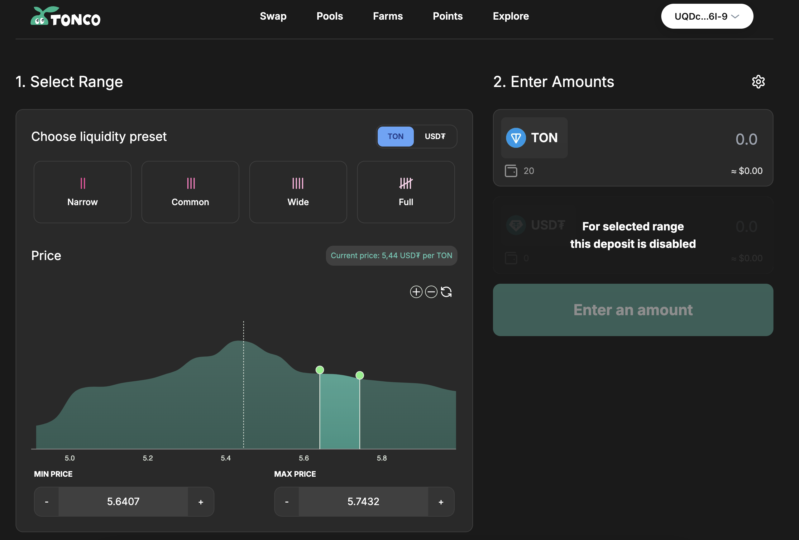 <mark style="background-color:yellow;">💡</mark> <mark style="background-color:yellow;">Example: You can trade USDT for 1,000 TON withoth any slippage. Add 5,500 USDT to a narrow price range in the TON/USDT pool. As the price moves, your USDT automatically converts to TON with zero slippage—a limit order in action</mark>