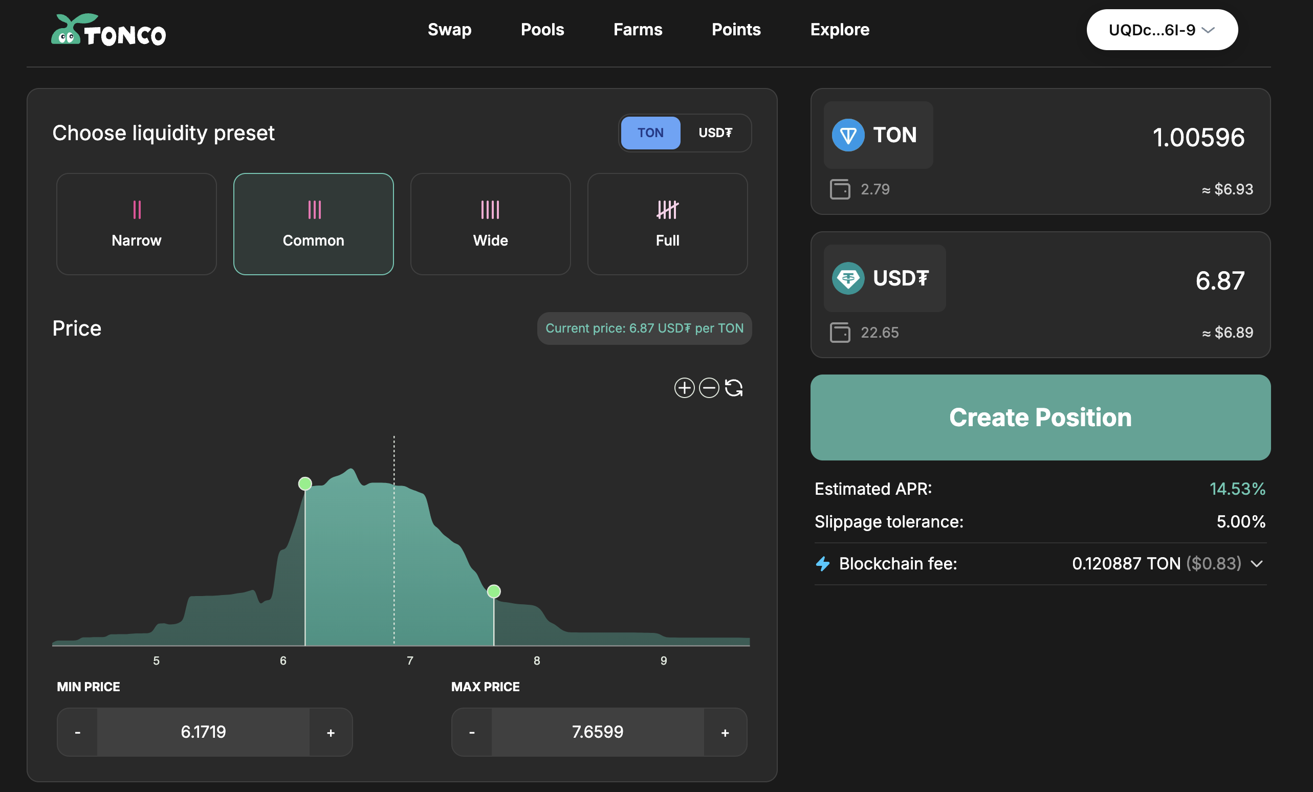 Предположим, вы хотите предоставить ликвидность в пуле TON/USDT. Текущая цена TON составляет $6.87, и вы размещаете ликвидность в диапазоне $6.17–$7.65 в соотношении 50:50 (6.87 USDT + 1 TON).