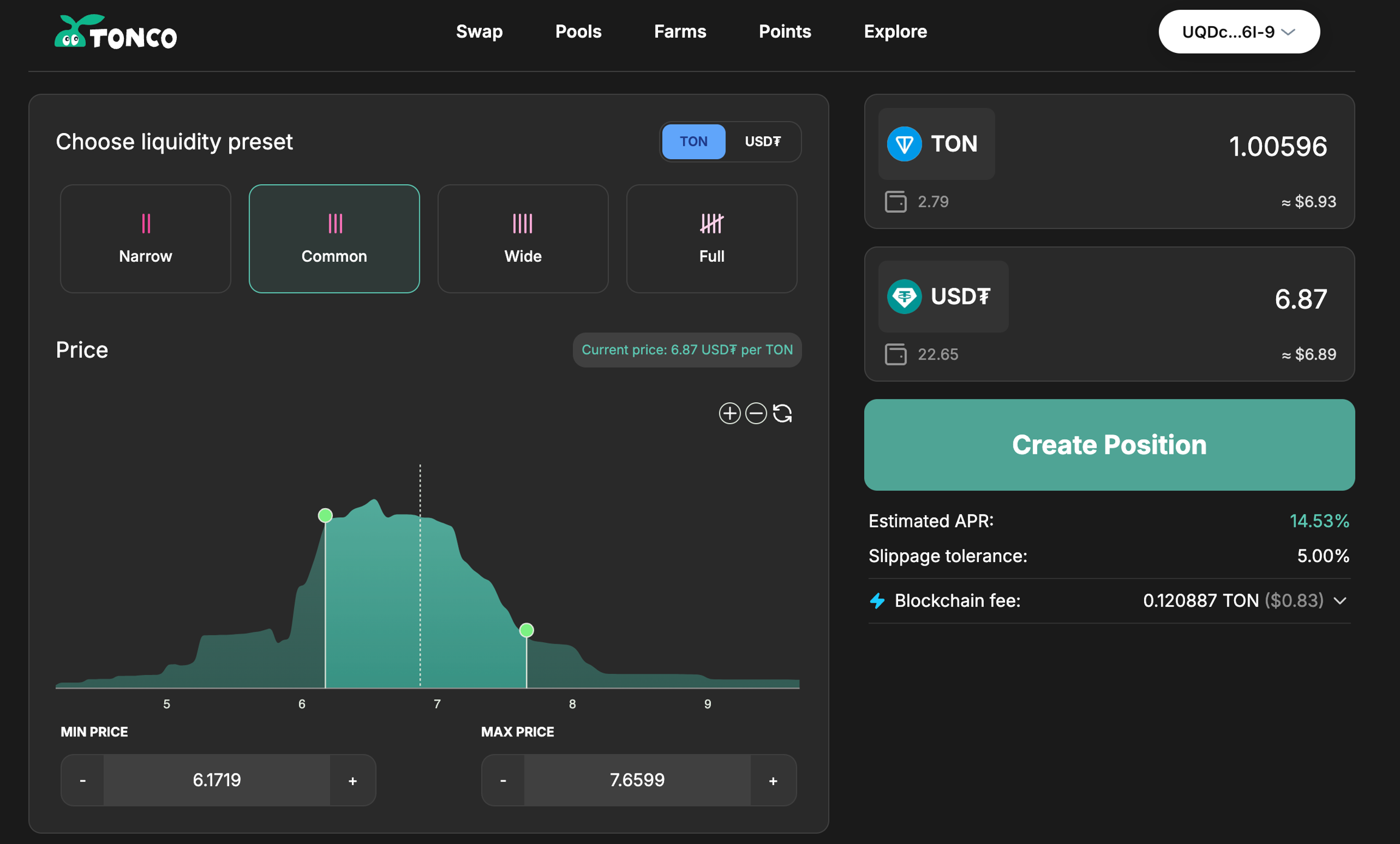 TONCO DEX позволяет пользователям концентрировать ликвидность в определенных ценовых диапазонах.