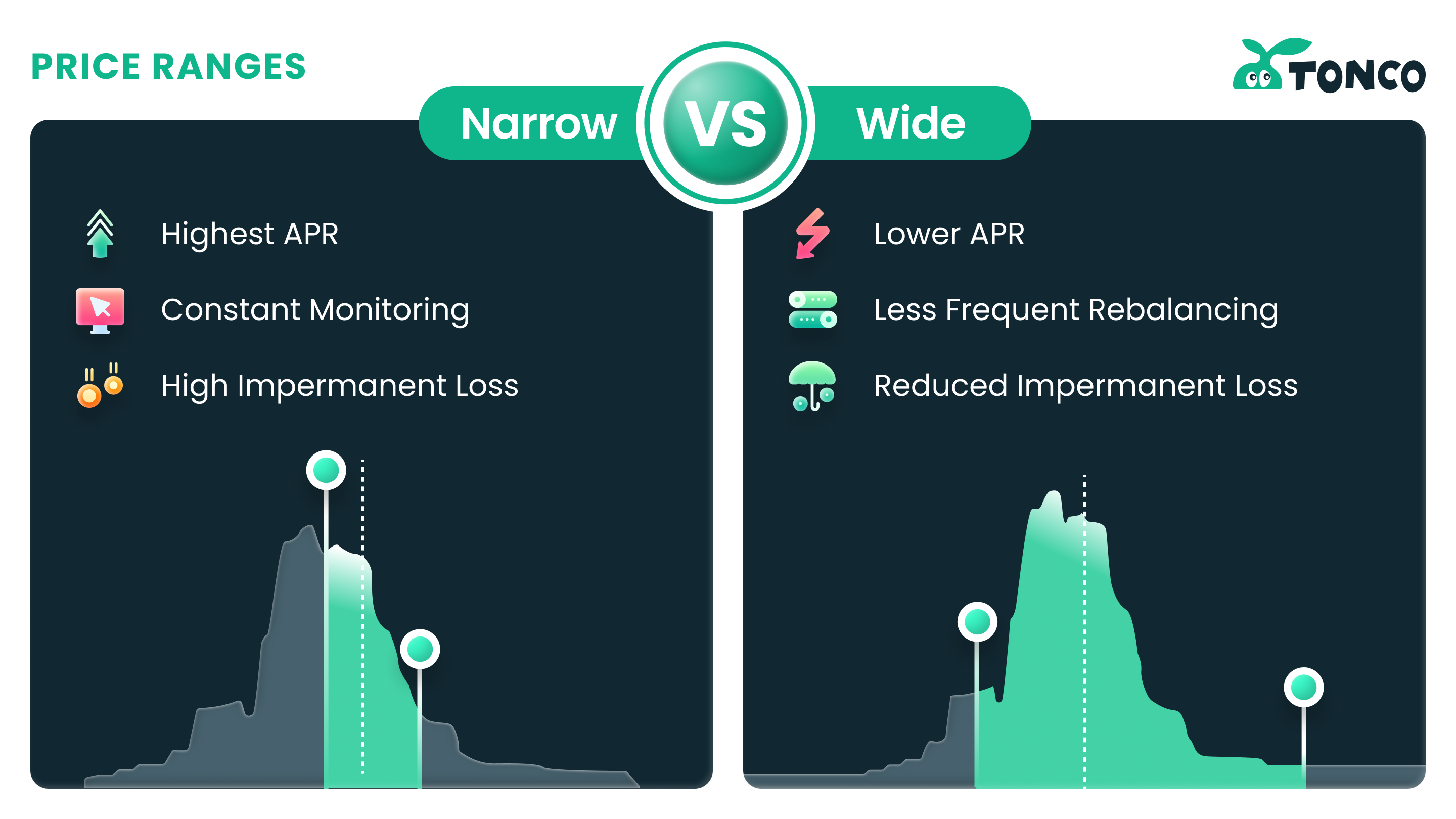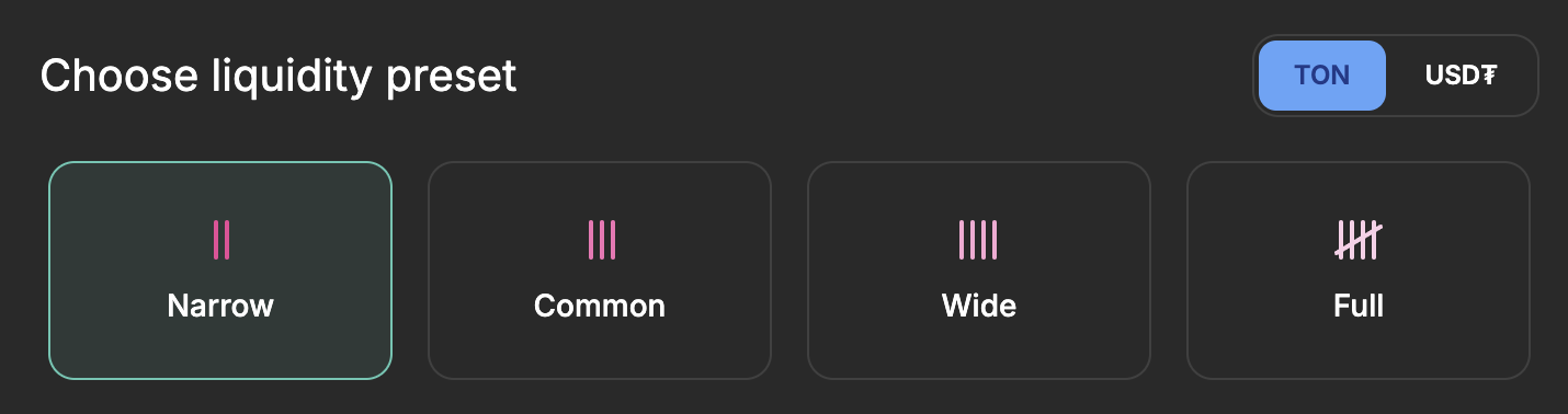 TONCO предоставляет пресеты для выбора диапазона: Узкий, Обычный, Широкий и Полный. Полный диапазон имитирует поведение V2, позволяя поставщику ликвидности покрывать весь ценовой спектр.