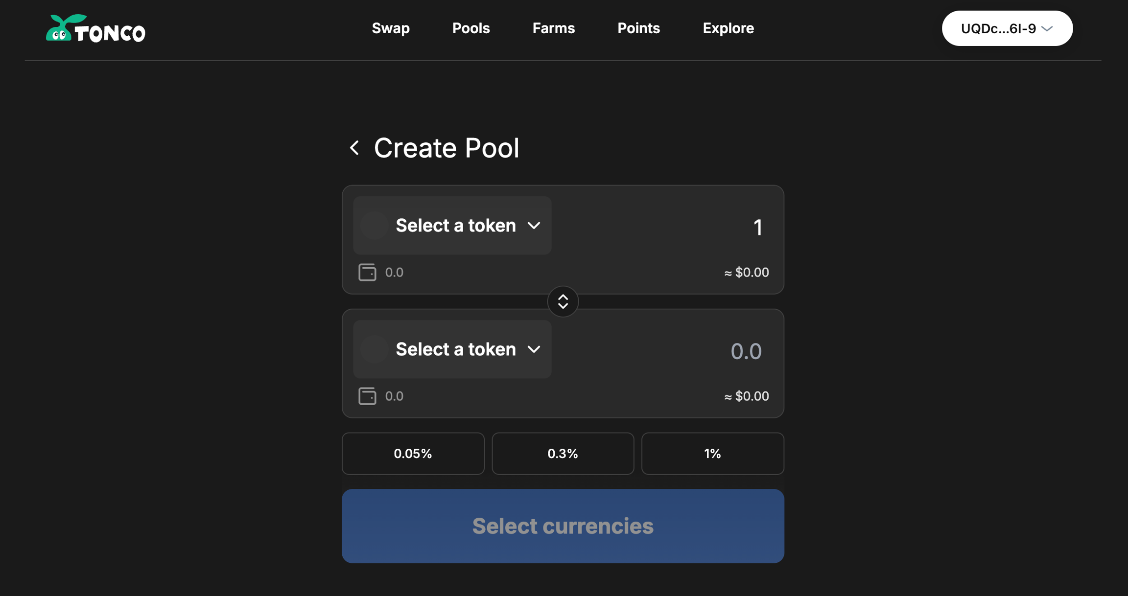 TONCO позволяет создателям пулов устанавливать размер комиссии с выбором одной из трех опций при создании пула: