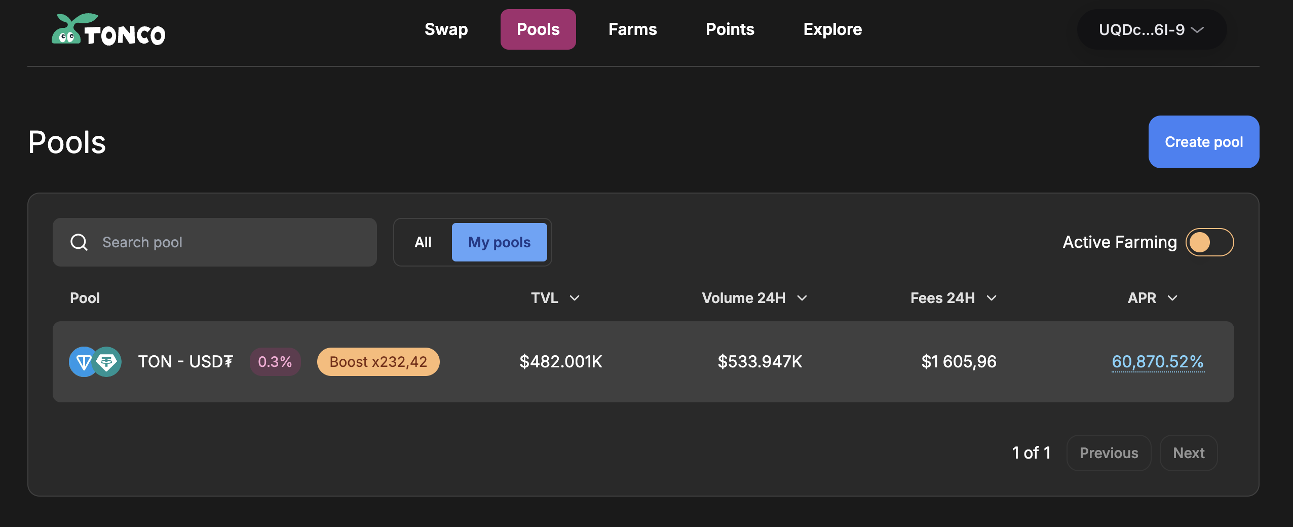 Вы можете просматривать все свои открытые позиции во вкладке "My pools" (Мои пулы) на странице Pools Page (Страница пулов).