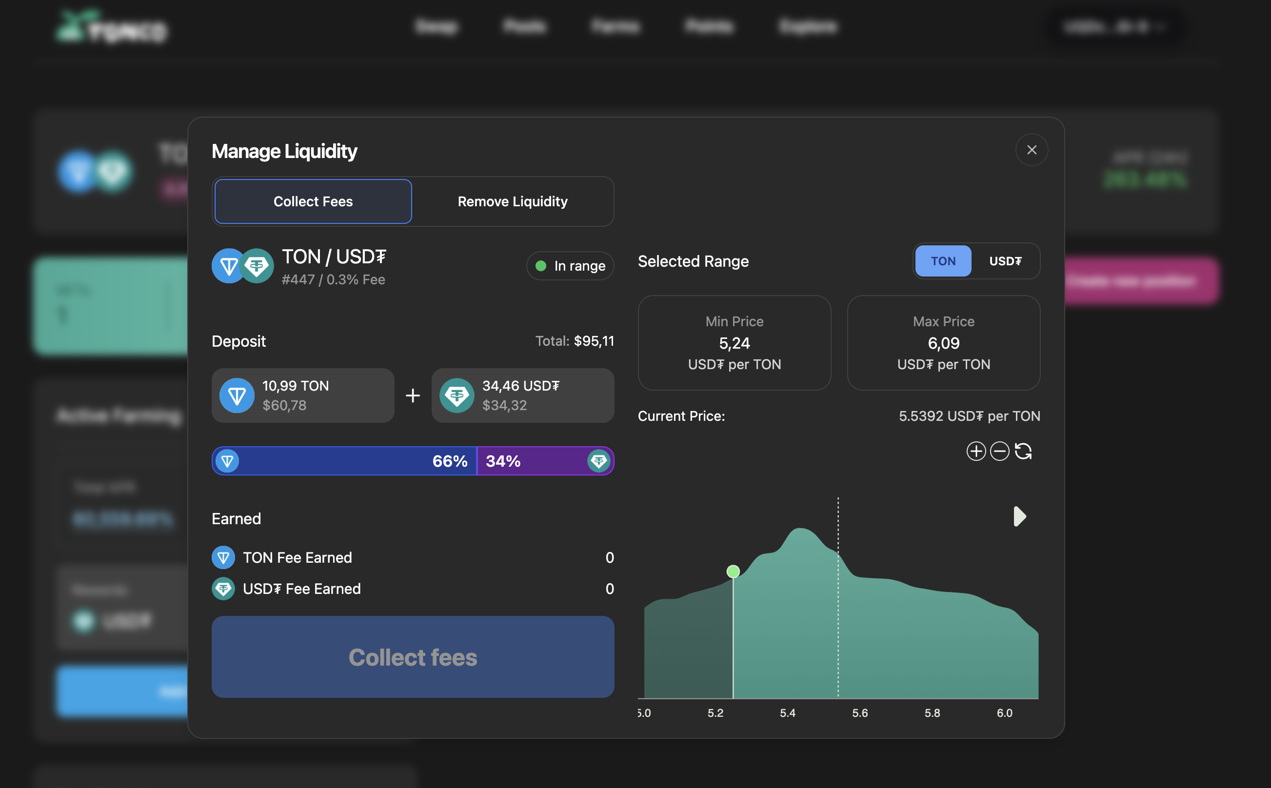 Нажмите на любую открытую позицию, чтобы увидеть подробные данные (общая стоимость, внесённые токены, ценовой диапазон, ожидаемые комиссии/вознаграждения и т. д.) в панели управления позицией.