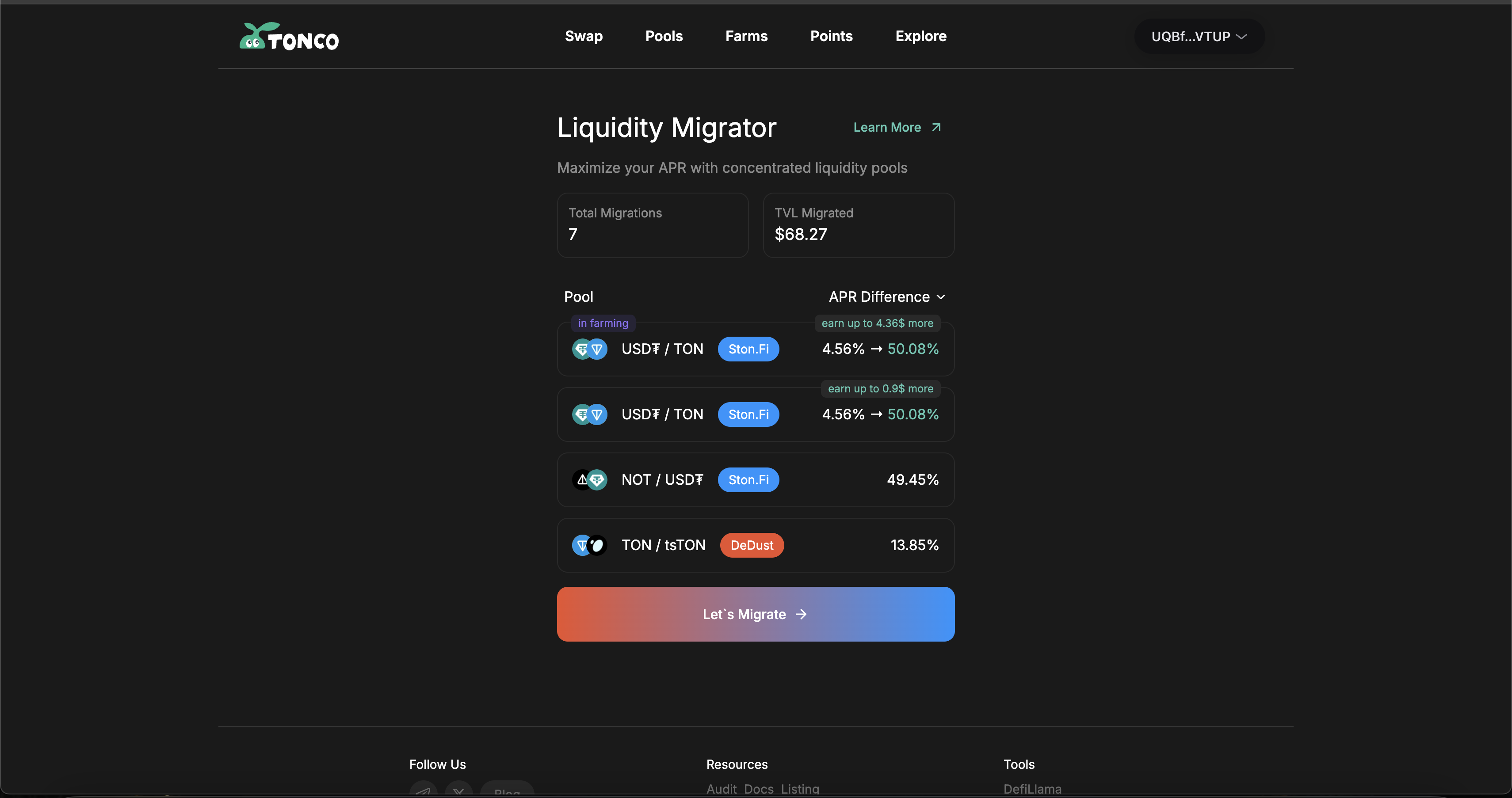 Если вы планируете переместить ликвидность с других DEX, таких как DeDust или STONfi, на TONCO, наш инструмент миграции **упрощает этот процесс.**&#x20;