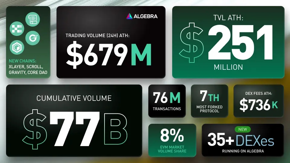 С совокупным объемом торгов, превышающим $95 миллиардов, $281 миллионом TVL и тщательными аудитами безопасности от ведущих фирм, Algebra предоставляет надежную технологию для децентрализованных бирж.