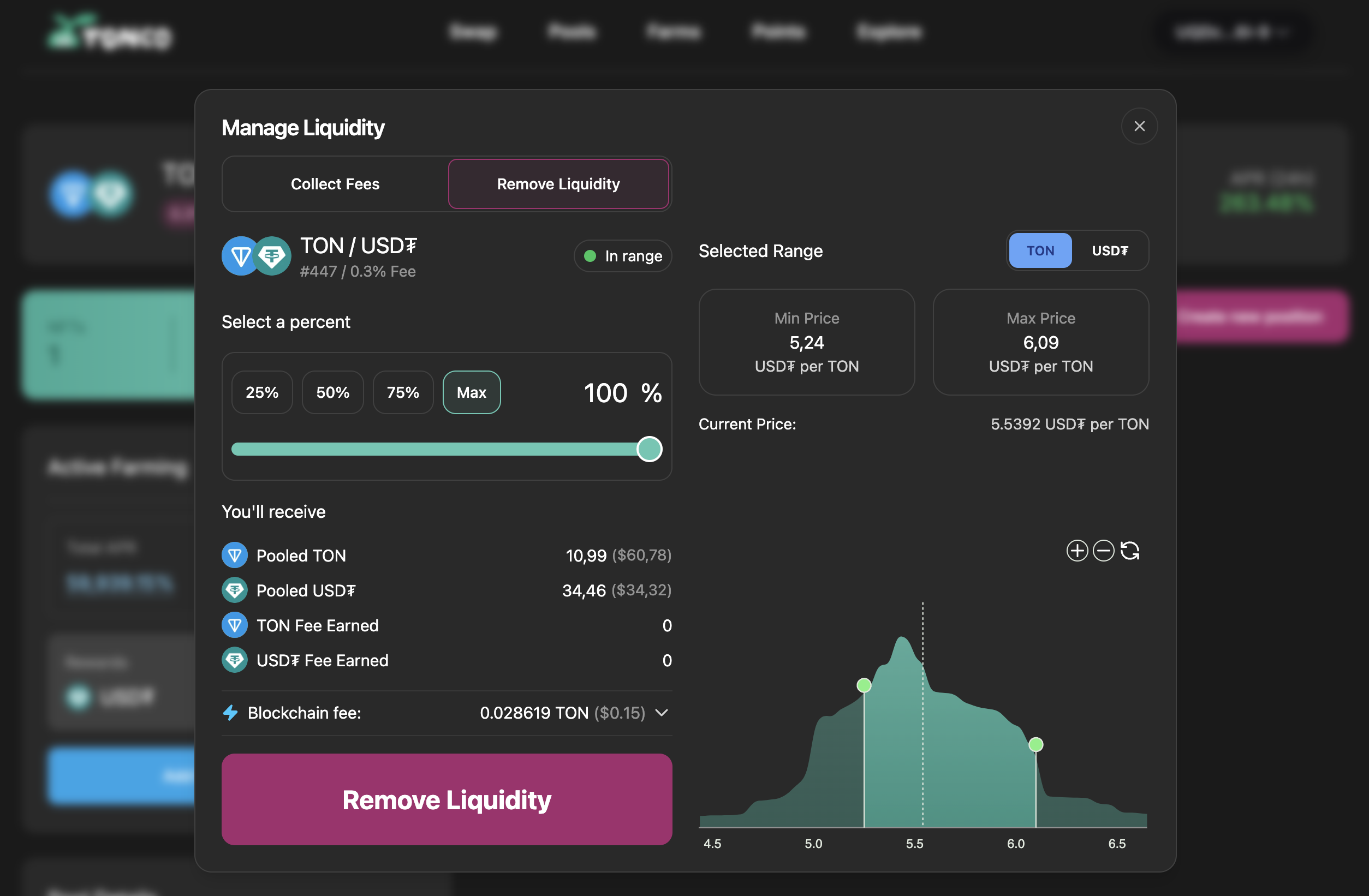 To remove liquidity and burn an LP NFT, select the ‘Remove Liquidity’ tab and choose the percentage of withdrawal.