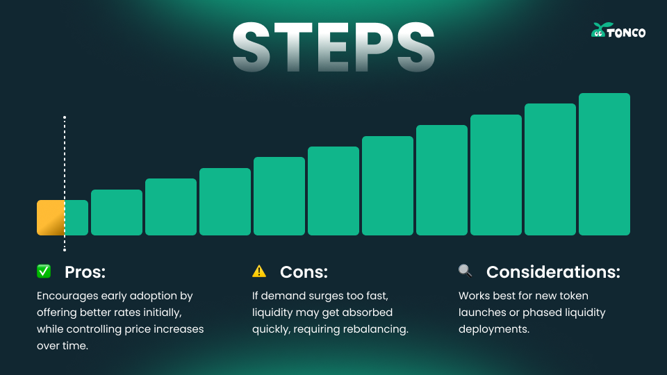 Gradually increases price levels to **manage early-stage price growth** while preventing sudden surges.